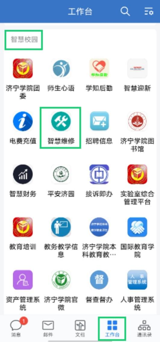 报修用户打开手机端“企业微信”APP,登录后进入“工作台--智慧校园--智慧维修”模块,按照根据页面提示填写后提交。【附图】