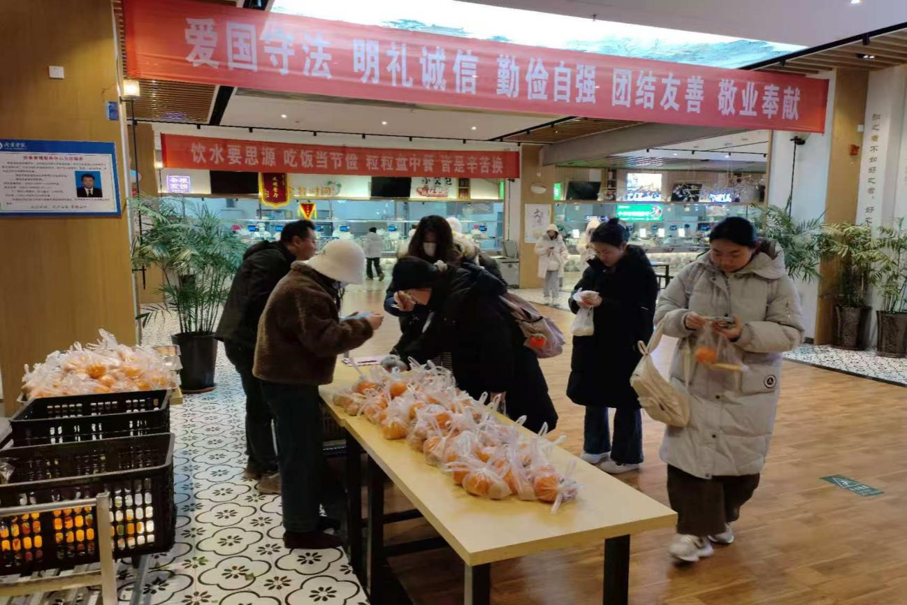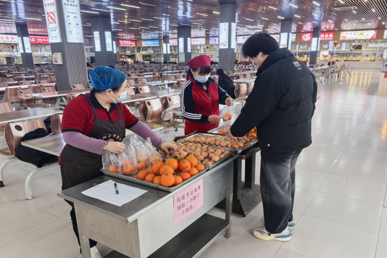 活动现场,食堂工作人员早早备好新鲜饱满的橙子和寓意“圆满成功”的鸡蛋。12月18日至19日,同学们只需出示考研准考证,就能免费领取这份暖心礼包。一个个金黄的橙子、一枚枚圆润的鸡蛋,承载着学校对考研学子最诚挚的祝福——愿大家一举“橙”名、前程似锦,考试顺利、圆满收官。